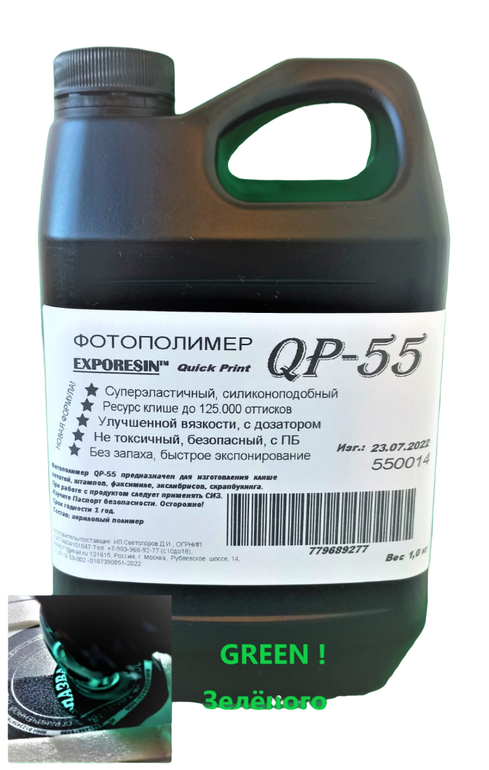 Цвет полимера светло-зелёный. Плотность 55 единиц по Шору (аналог VX55)